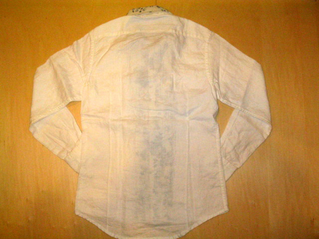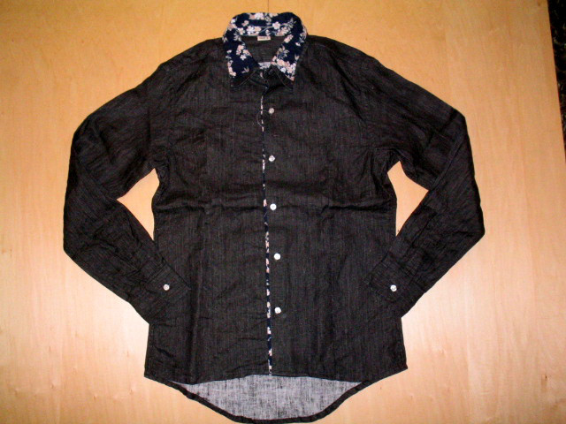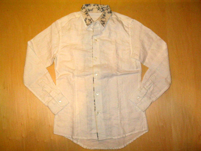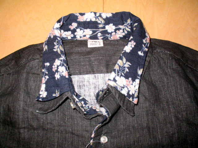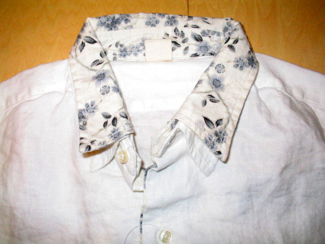 軽く柔らかい肌触りのガーゼ生地を使った長袖シャツの衿の部分に、従来の生地の衿と『花柄』の生地を用いた衿、二つの衿を併せ持っています。