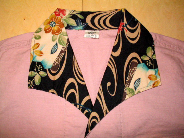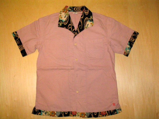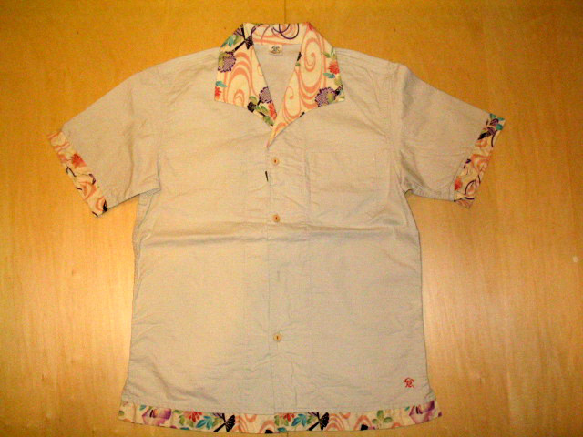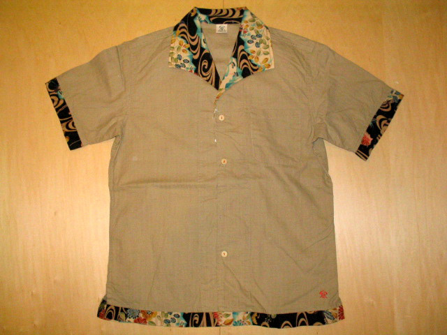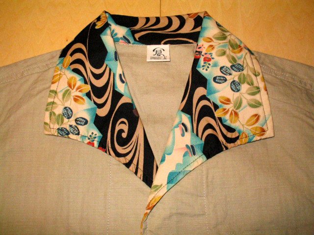 オープンシャツの衿・袖口・裾に綿素材の和柄生地を使用して切り替えを施しています。