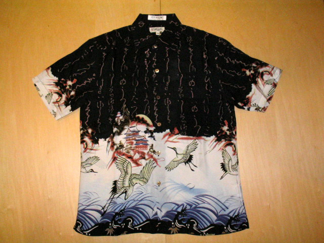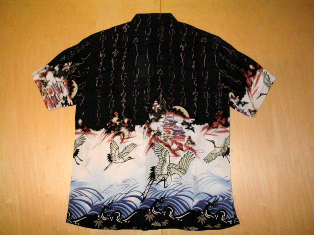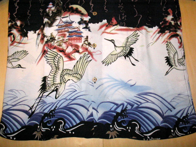 上半分には真っ暗な闇夜にびっしりと埋め尽くされた文字、下半分には月を望む山を背景にした「城」と、裾に「荒れ狂う波間」とその上を「飛び交う鶴」の柄を配しています。