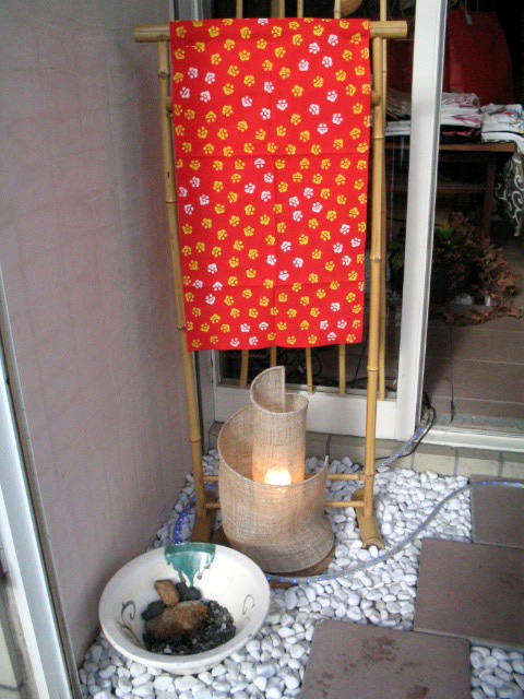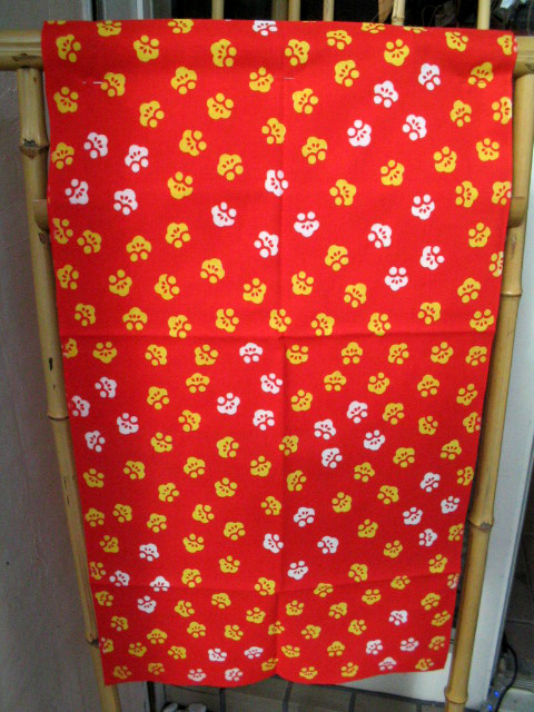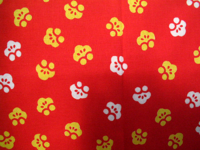 赤の地色に、白と黄色で小さく梅の花をかたどった文様を散りばめています。