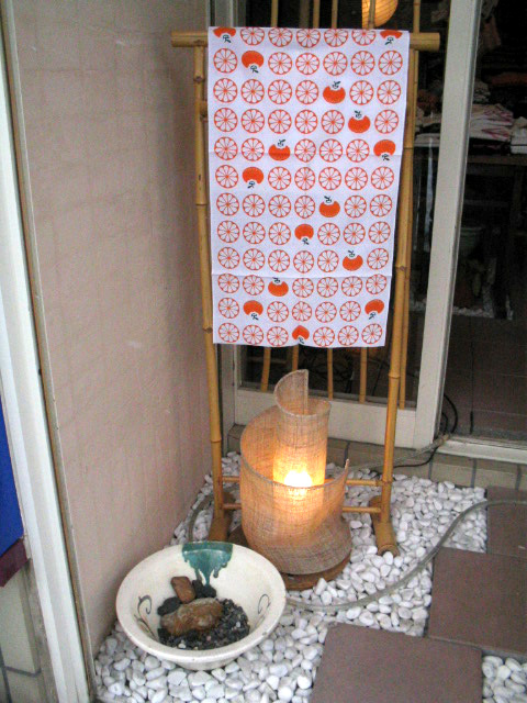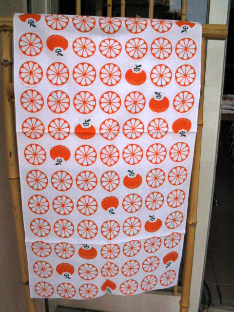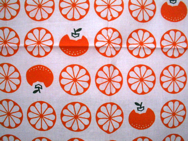白地にオレンジで丸ごとと輪切りのみかんを、