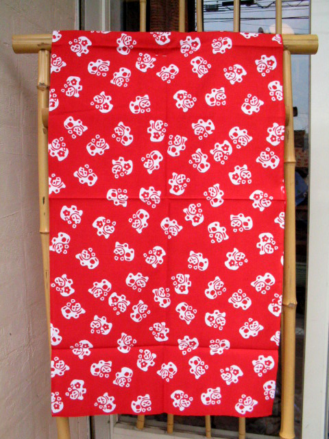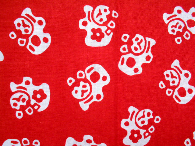 赤い地色に白抜きで数種類の犬の張り子柄を配しています。