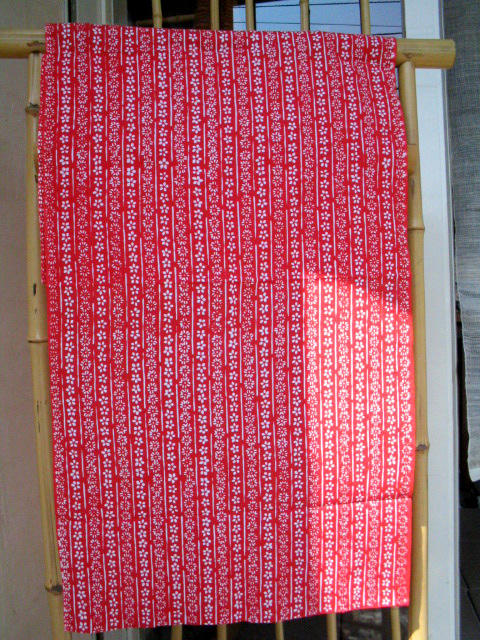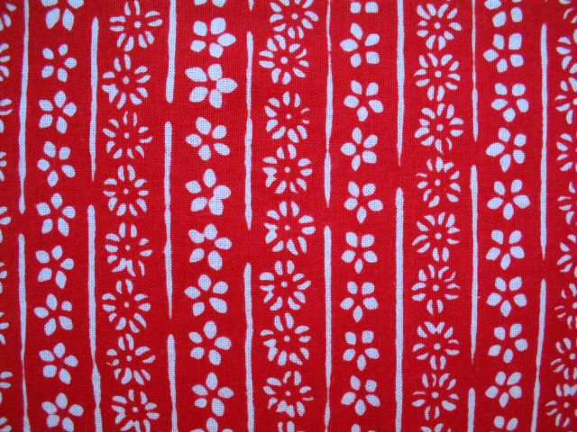 赤い地色に小さな2種類の花柄を白抜きで並べ縞模様にしています。