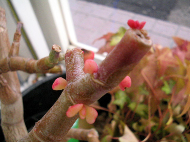 どうやら枝先の赤い部分が、葉の変わりになっているようです。