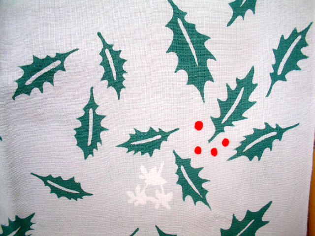 鮮やかな緑色の葉と、真っ赤な実、そして白い花を散りばめています。