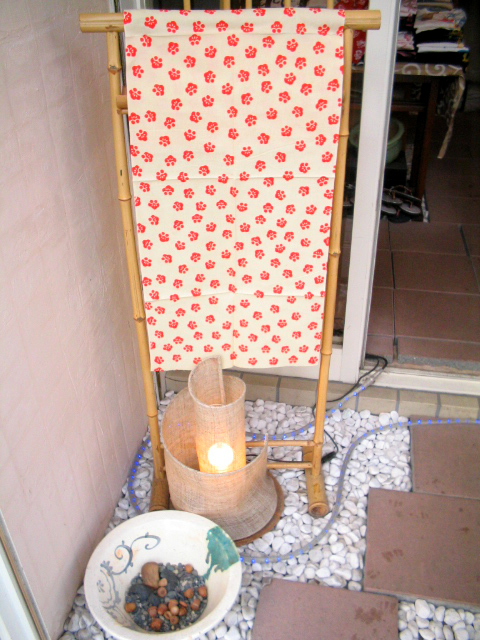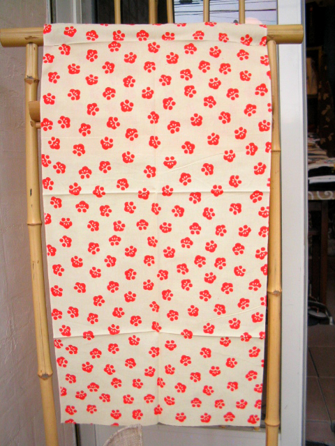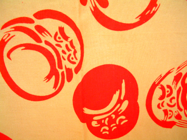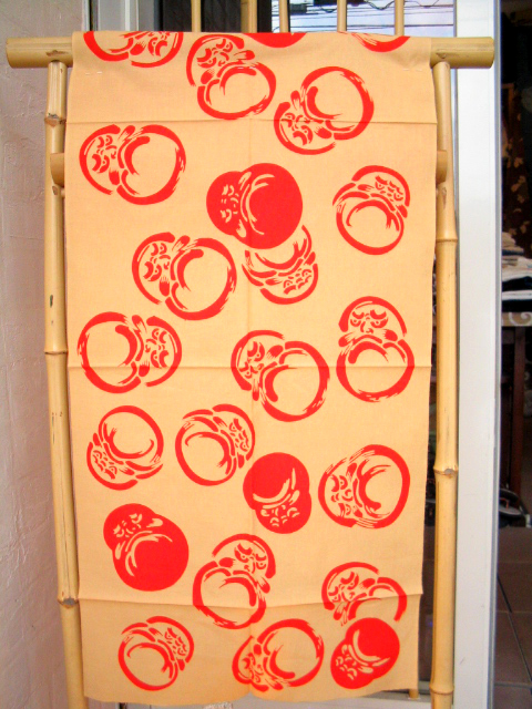 薄茶色の地色に、朱色で豪快なヒゲと眉毛が印象的なダルマの柄を